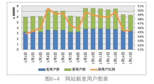 如图6-4所示,可以用柱状堆积图显示新用户和老用户的数量变化,堆积的结果就是网站总用户数量的变化,结合新用户比例的折线,通过分析网站新用户的数量和比例的变化能够直接反映网站在营销推广上的效果。